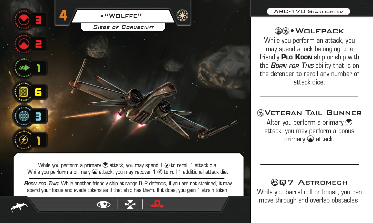 - Wolfpack - While you perform an attack, you may spend a lock belonging to a friendly Plo Koon ship or ship with the Born For This ability that is on the defender to reroll any number of attack dice.