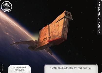 The Hound's Tooth was a modified YV-666 light freighter manufactured by the Corellian Engineering Corporation. It was the personal starship of Bossk, a Trandoshan bounty hunter. During the Age of the Empire, Bossk flew the Hound's Tooth to the Outer Rim planet of Lothal to collect a bounty on the Dug criminal Gronson Takkaro. For much of that trip, the ship remained at the spaceport of Lothal's Capital City. read more