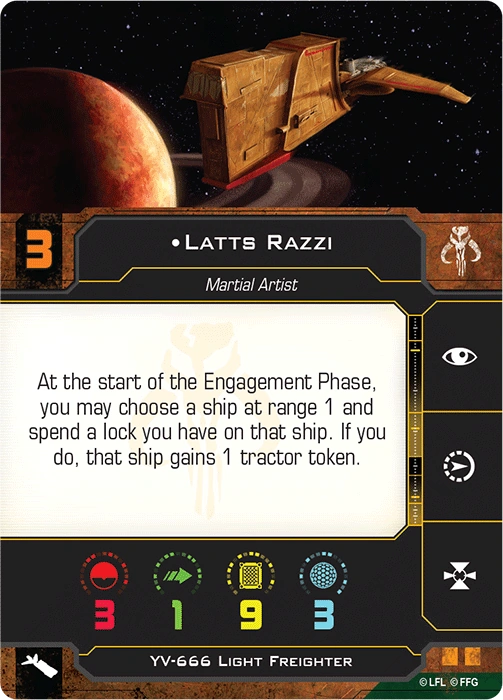 At the start of the Engagement Phase, you may choose a ship at range 1 and spend a lock you have on that ship. If you do, that ship gains 1 tractor token.